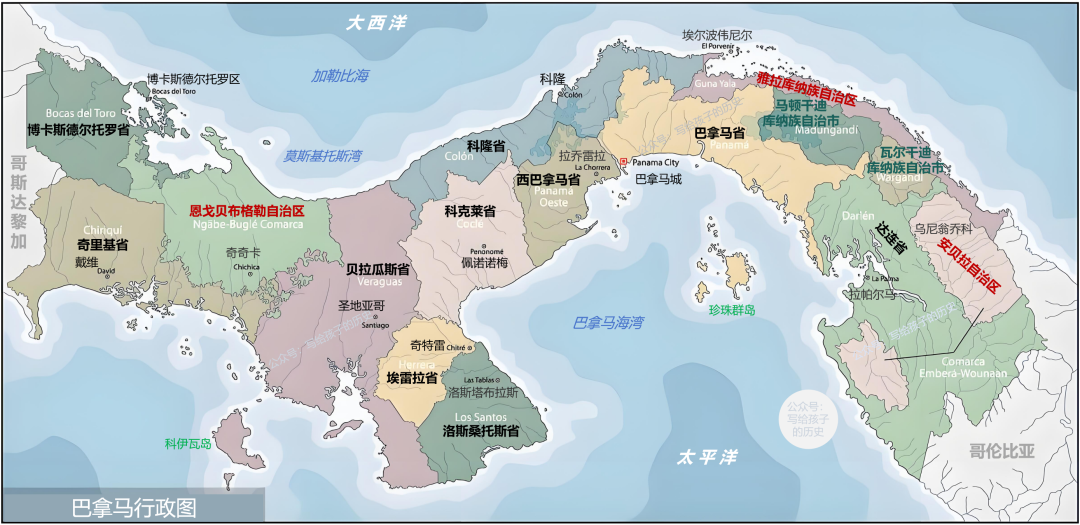 巴拿马全国划分为10个省和5个印第安居民区(3个自治区、2个自治市)。