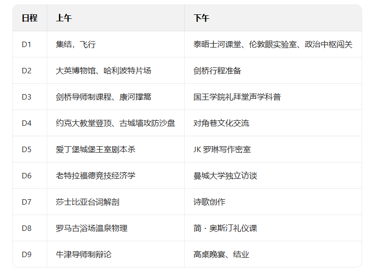 以“把世界重新变成课本”为核心,打造12天全境研学之旅。通过剑桥真实导师制课程、牛津辩论、全境地标实景教学,将地理、物理、历史、文学、经济等知识转化为可体验、可量化的任务;同步设置家长“放手指标卡”与孩子“成长日志”,搭配全程跟拍“少年领袖”微电影、时间胶囊等仪式感环节,兼顾学术启蒙、独立能力培养与跨文化体验,让孩子从“要我学”升级为“我要学”。
